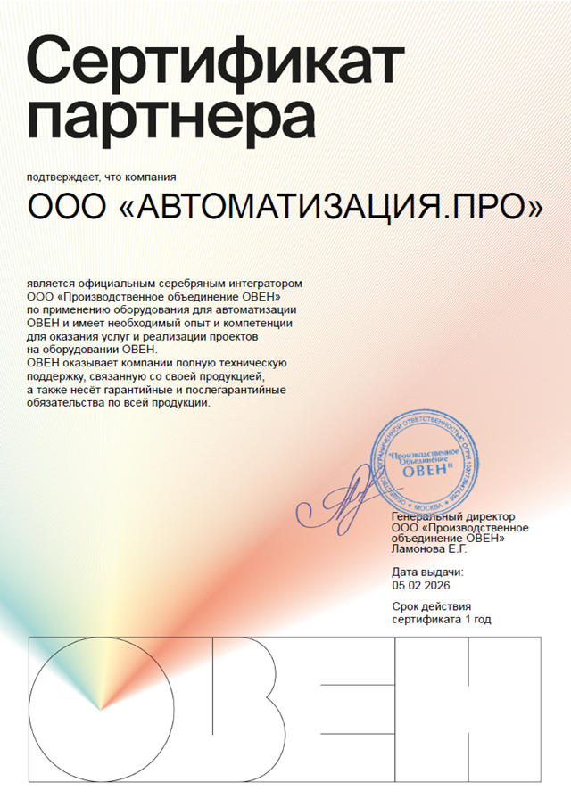 Статус подтверждает наличие у ООО "АВТОМАТИЗАЦИЯ.ПРО" необходимого опыта и компетенций для оказания услуг и реализации проектов с автоматикой ОВЕН.