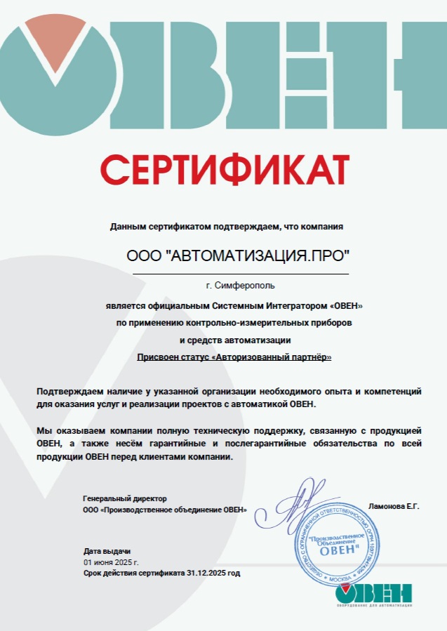 ООО "АВТОМАТИЗАЦИЯ.ПРО" (г. Симферополь) получило статус официального Системного Интегратора «ОВЕН» по применению контрольно-измерительных приборов и средств автоматизации. Нашей компании присвоен статус «Авторизованный партнёр».